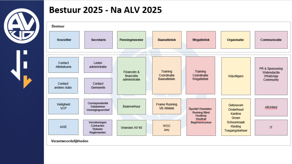 Naast de gebruikelijke rollen voorzitter, secretaris en penningmeester hebben we ook bestuursleden voor baanatletiek, wegatletiek, organisatie en communicatie.